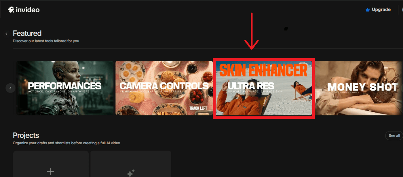 Start in your Invideo workspace and navigate to the Trends section. From there, open the UltraRes tab. This is where all upscaling workflows live, designed specifically for ad and content production rather than standalone image editing.