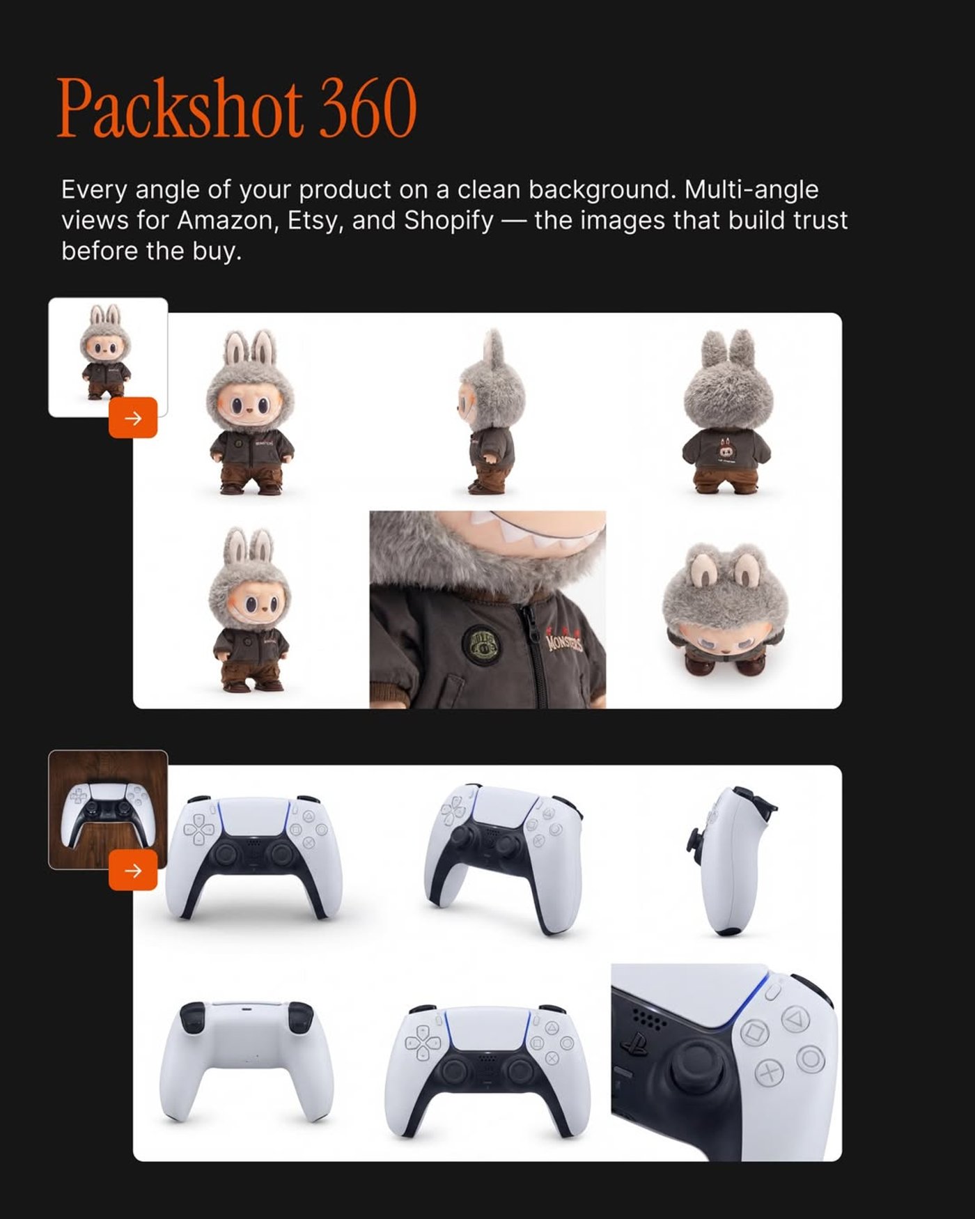 360 style packshots. These are multi-angle views of your product, such as front, back, side, top, and close detail, that build trust before the buy and can work on Amazon, Etsy, Shopify, and other marketplaces.