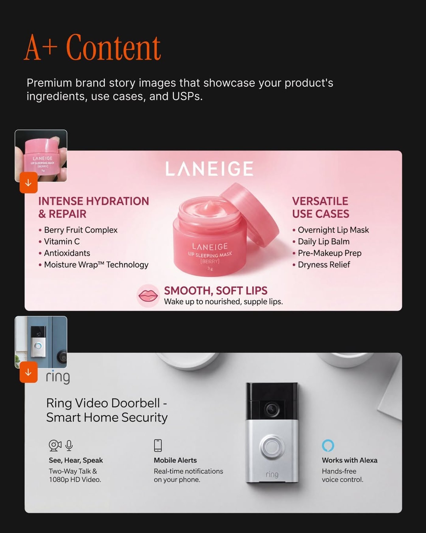 A Plus content-friendly visuals. These are wider or more modular images that can live in A Plus modules and tell your brand story, show ingredients or materials, and underline unique selling points.