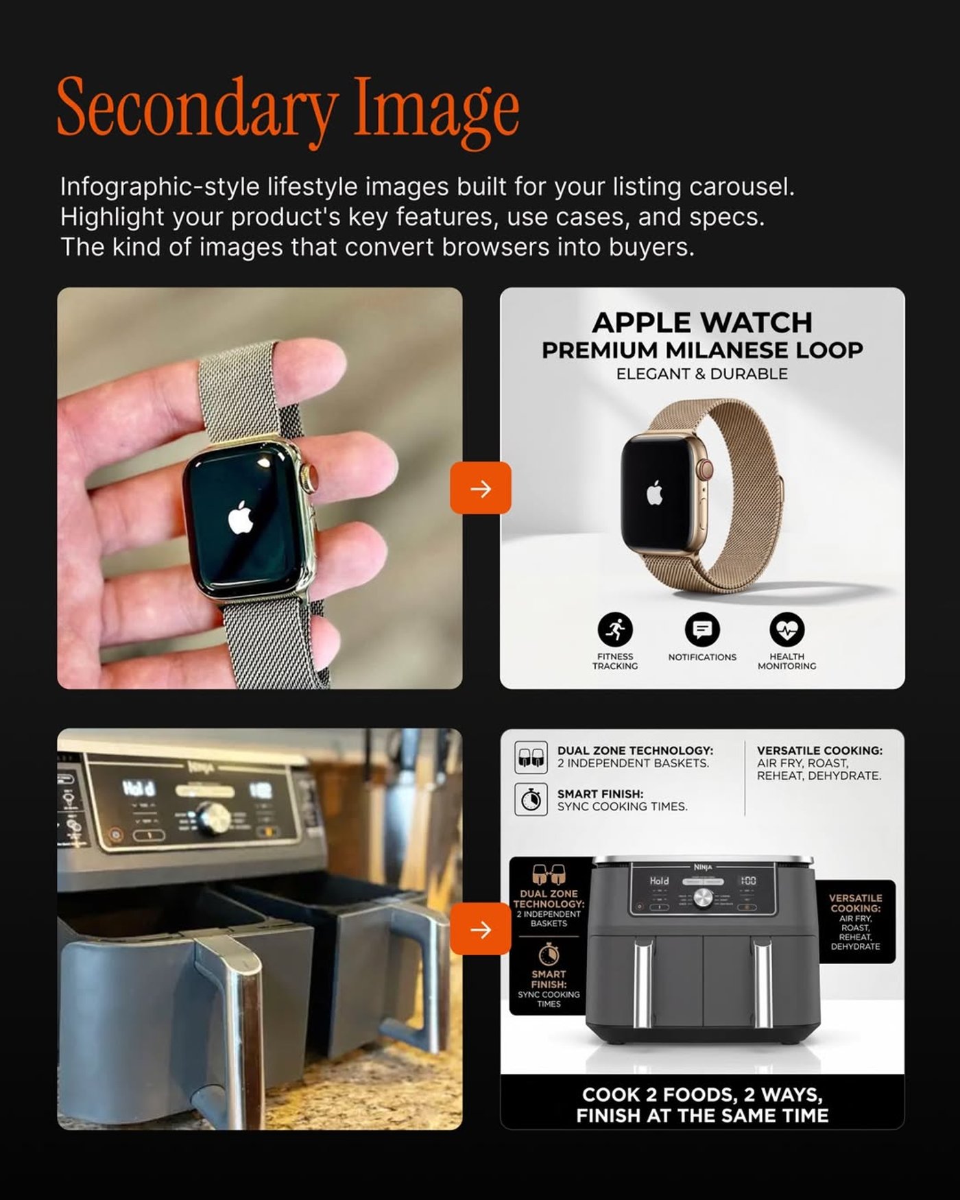 Secondary images that function as infographic style lifestyle shots. These combine realistic scenes with short, clear callouts that highlight features, use cases, and specifications. They are built to convert browsers into buyers.