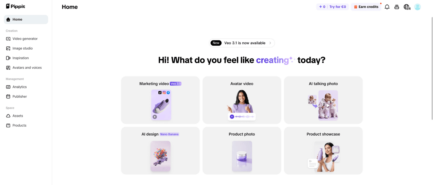 Pippit AI positions itself as a "smart creative agent" focused specifically on marketing video production. The interface prioritizes intuitive workflows and strong templates designed around common marketing use cases like product launches, feature announcements, social promos, and avatar-driven explainers.