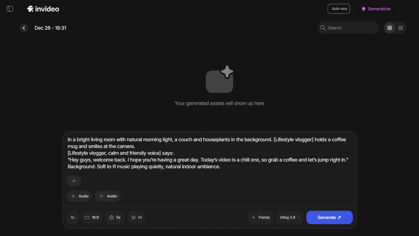 Want to learn how? Well, imagine you’re an influencer creating your first vlog. Here’s how you can use Kling 2.6 on invideo to create a solid 10-second intro or promo video: