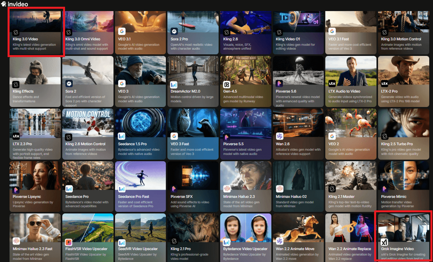 You don’t need to sign up or export separately to combine these models. Both Grok Imagine and Kling 3.0 are readily available directly inside the invideo workspace.