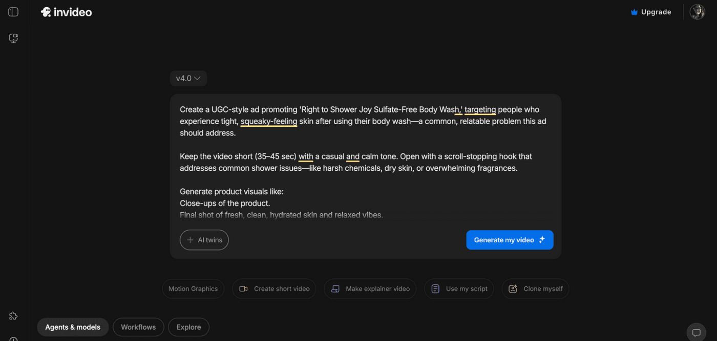 In each case, the goal is not a finished asset. The goal is a fast validation loop: use Grok Imagine to find the angle that resonates, then rebuild and polish that angle elsewhere. Once a concept wins, you can bring the chosen clip or idea into invideo to add captions, voiceover, and brand assets.