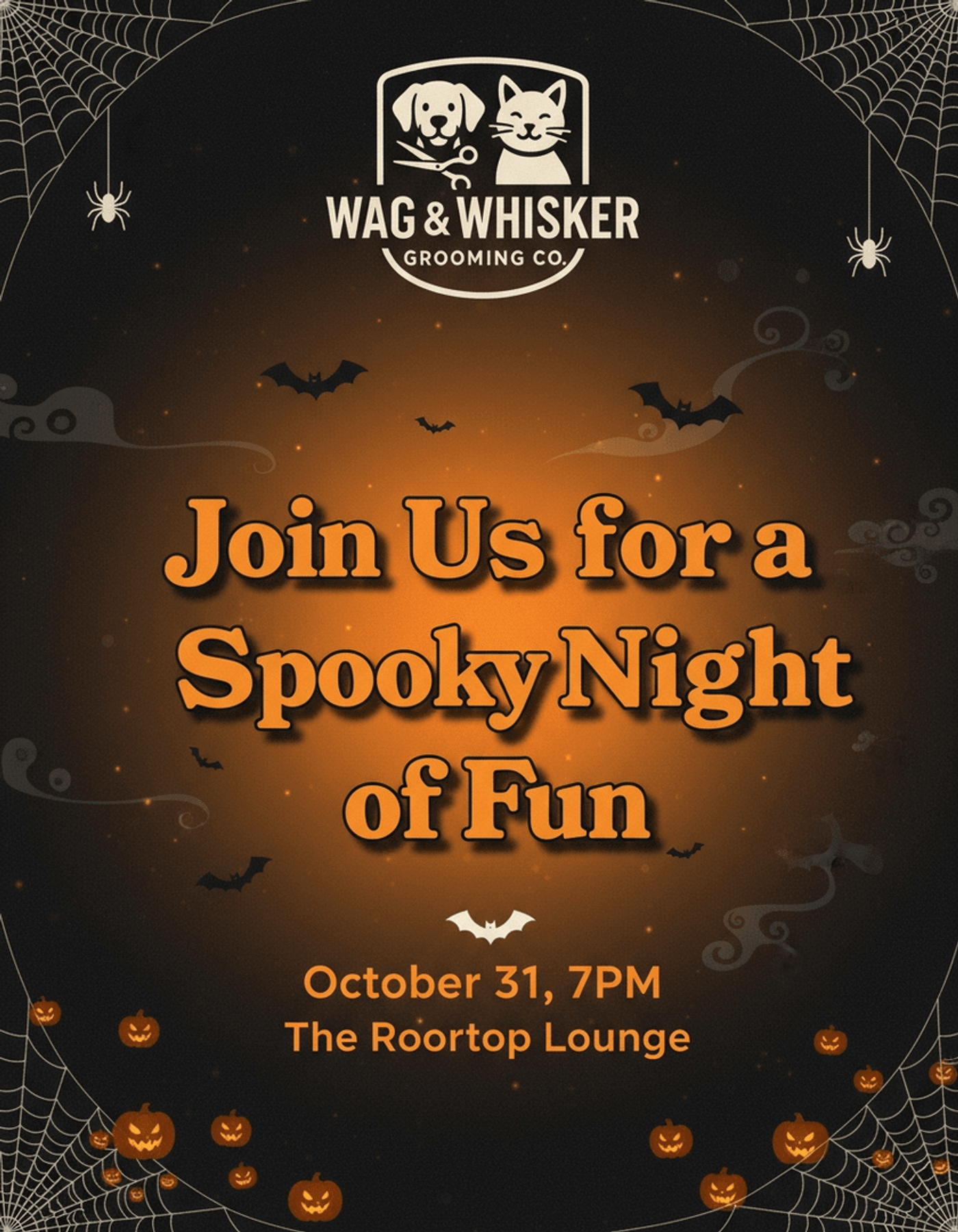 Just upload your company logo, describe the layout you want and let the AI handle the rest. See this example invitation poster from Wag & Whisker pet grooming company.