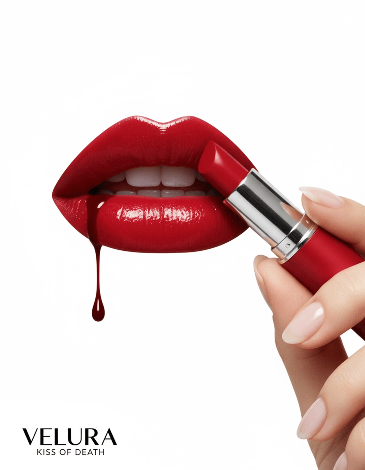 “A poster of glossy red lips with a faint drop of blood dripping from one side. On the side, show the model's hand holding a red lipstick. White background with subtle lighting, cinematic composition, minimal text showing the brand name ‘Velura’ and tagline.Kiss of Death.”