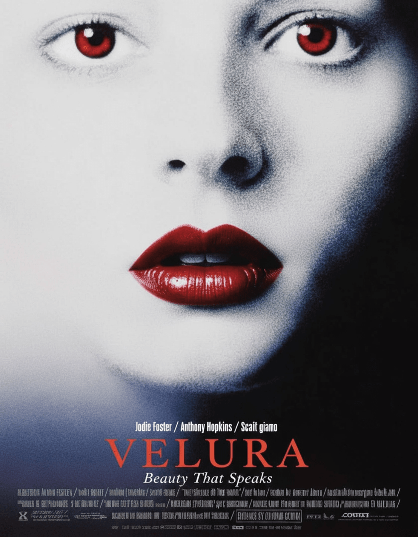 “Recreate a Halloween-themed poster inspired by ‘The Silence of the Lambs’ featuring a dark background and a close-up face with red lips replacing the butterfly. Replace the movie title with the lipstick brand name ‘Velura’ and add a subtle tagline ‘Beauty That Speaks.’ Keep the rest of the image intact and unchanged.”