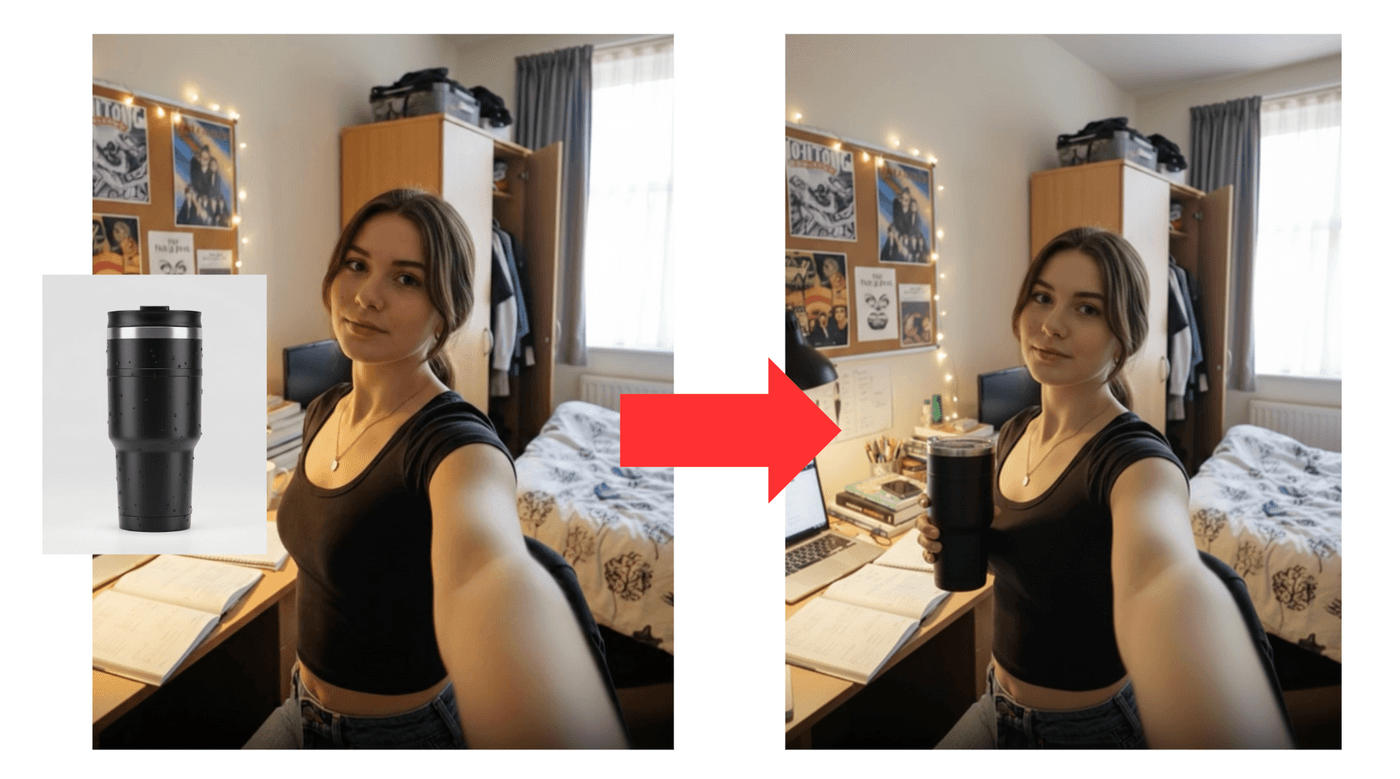 You can get even more creative by adding a product into the scene before turning it into a video. For example, if you’re promoting a tumbler brand, merge your product image into your portrait by prompting like "make the girl hold the tumbler“ using the Halloween workflows on invideo.