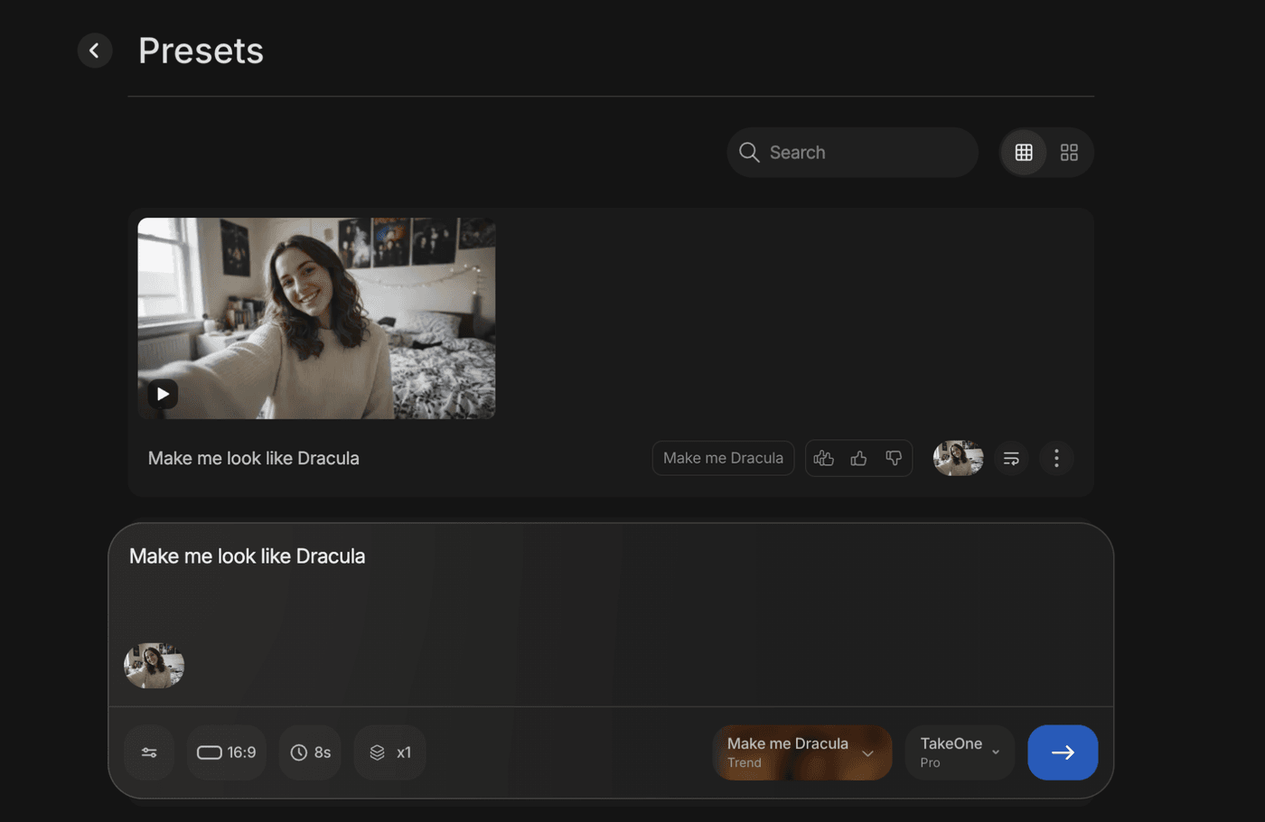 If you’re a content creator or an influencer who wants a quick way to make a transformation video for Halloween, this preset is for you. In the list of presets, select the “Make me a Dracula” and you will be redirected to the asset generator dashboard.
