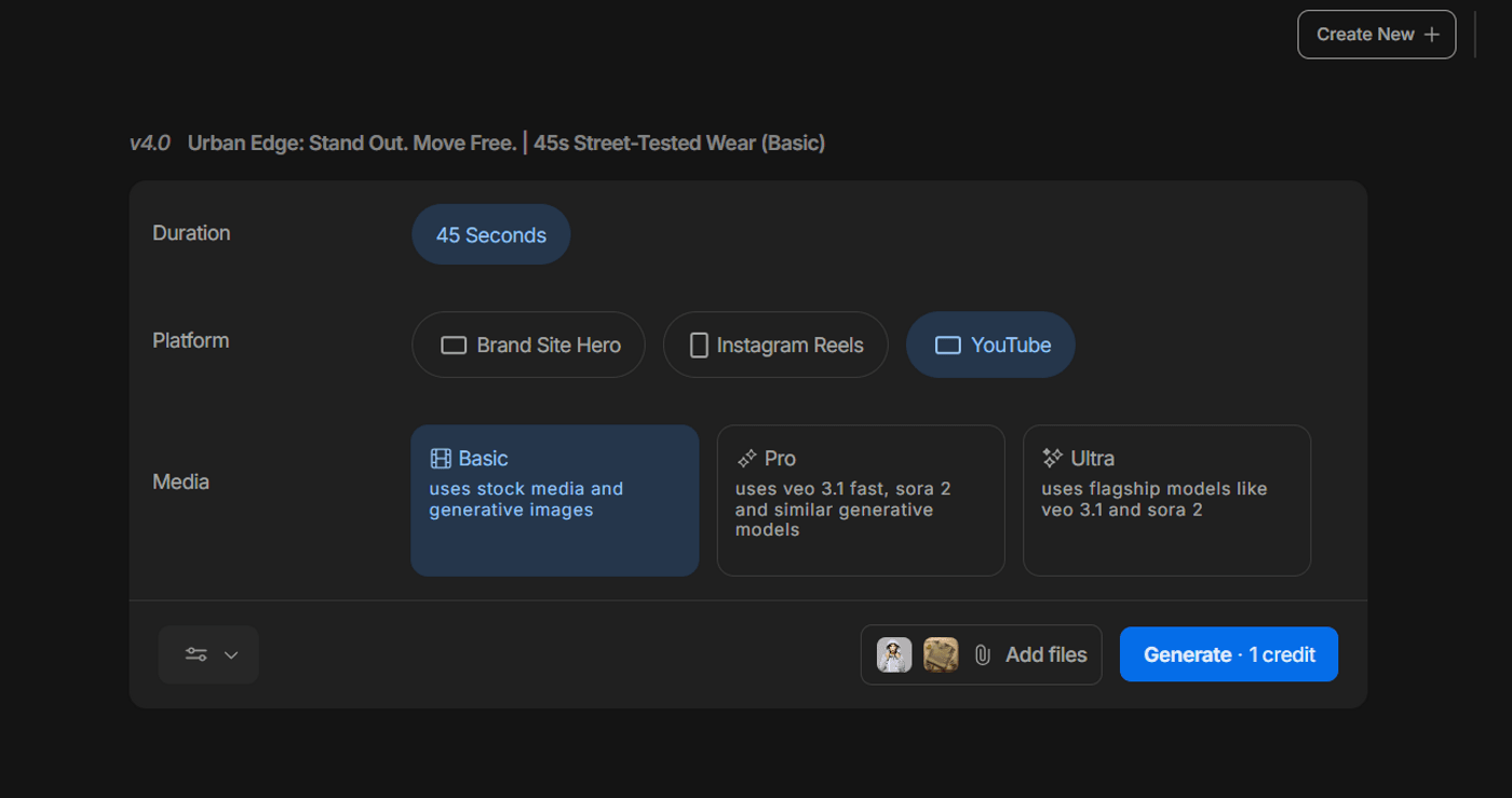 Next, choose the duration, platform, and media you want to include in the video. These attachments act as your steering wheel as they set the color palette, product look, and the faces/styles you prefer.
