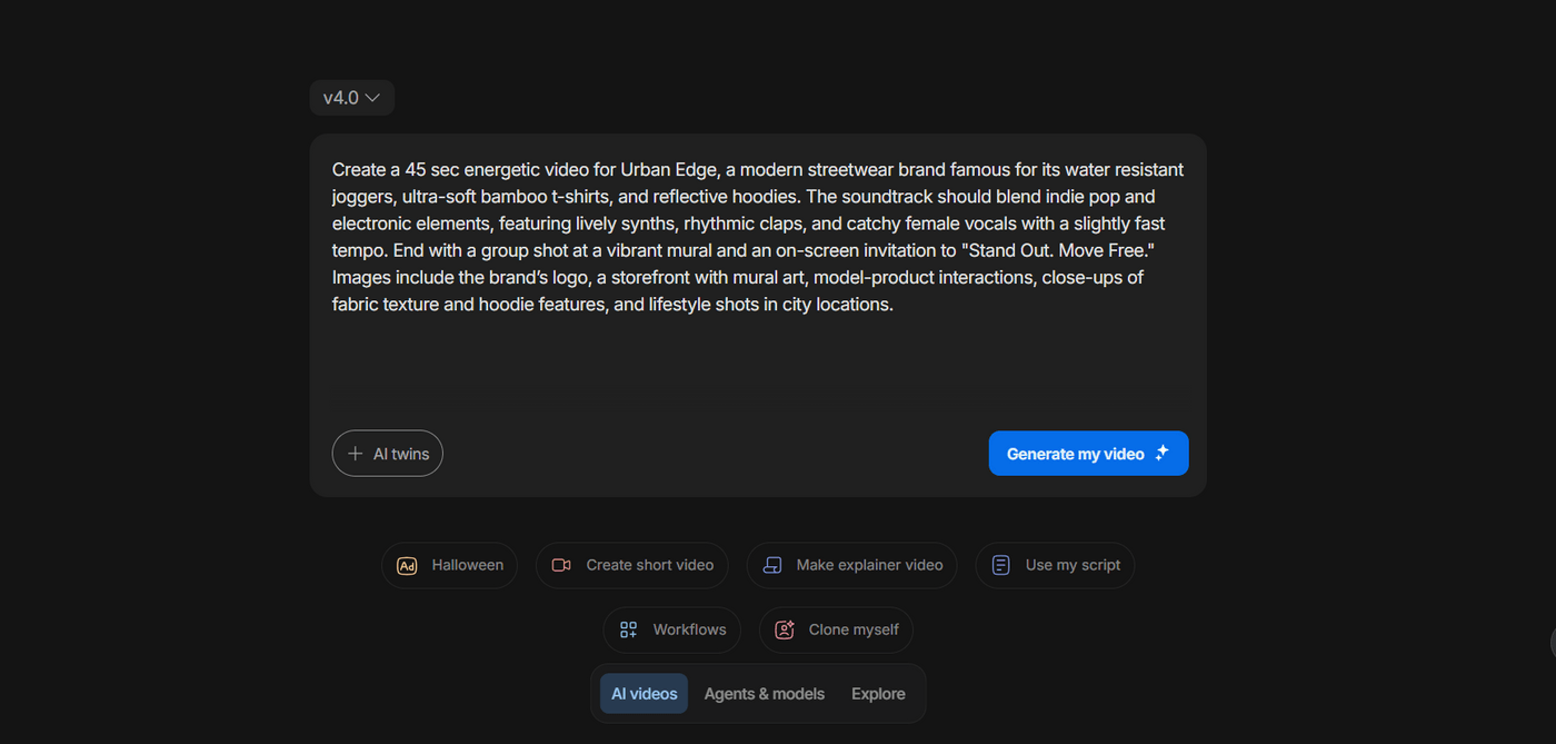 Once done, type your prompt into the “prompt” box precisely as you want it. Add details like brand name, mood, genre, instruments, and type of video.