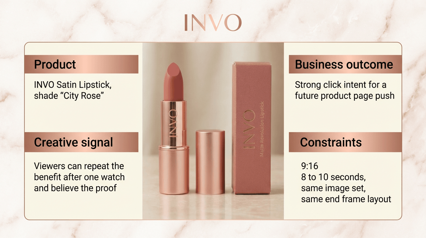This walkthrough uses a demo brand called INVO. The product is a satin finish lipstick in a fashion and lifestyle category. The point is not lipstick. The point is the workflow for generating and testing ad variations fast, using invideo.