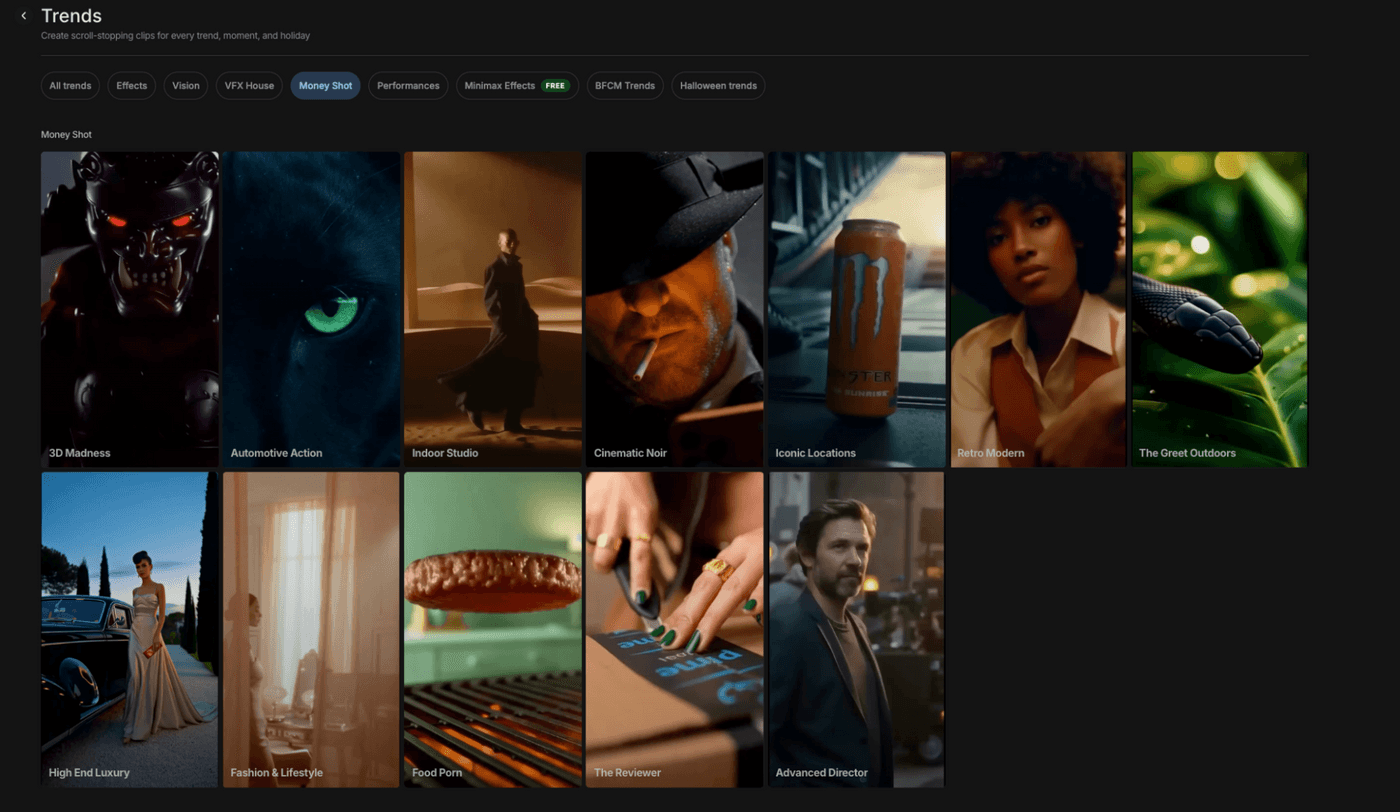 All that said, you’ll be surprised to know that invideo’s Money Shot acts as the creative director for your product shoot. Each style is built for a specific product story and comes with commercial-grade elements like defined camera movement, clean transitions, controlled lighting, and pacing. The preset trend you choose becomes your all-in-one video direction set.