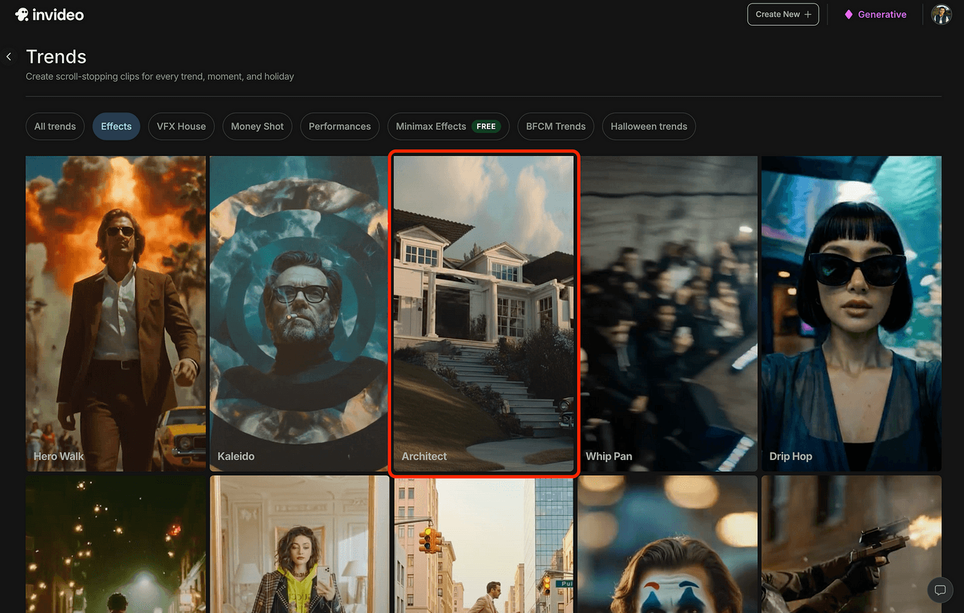Head over to invideo’s video generator dashboard and open the Agents & Models section. Under the Trends tab, click the Architect effect and choose a project to start creating a video.