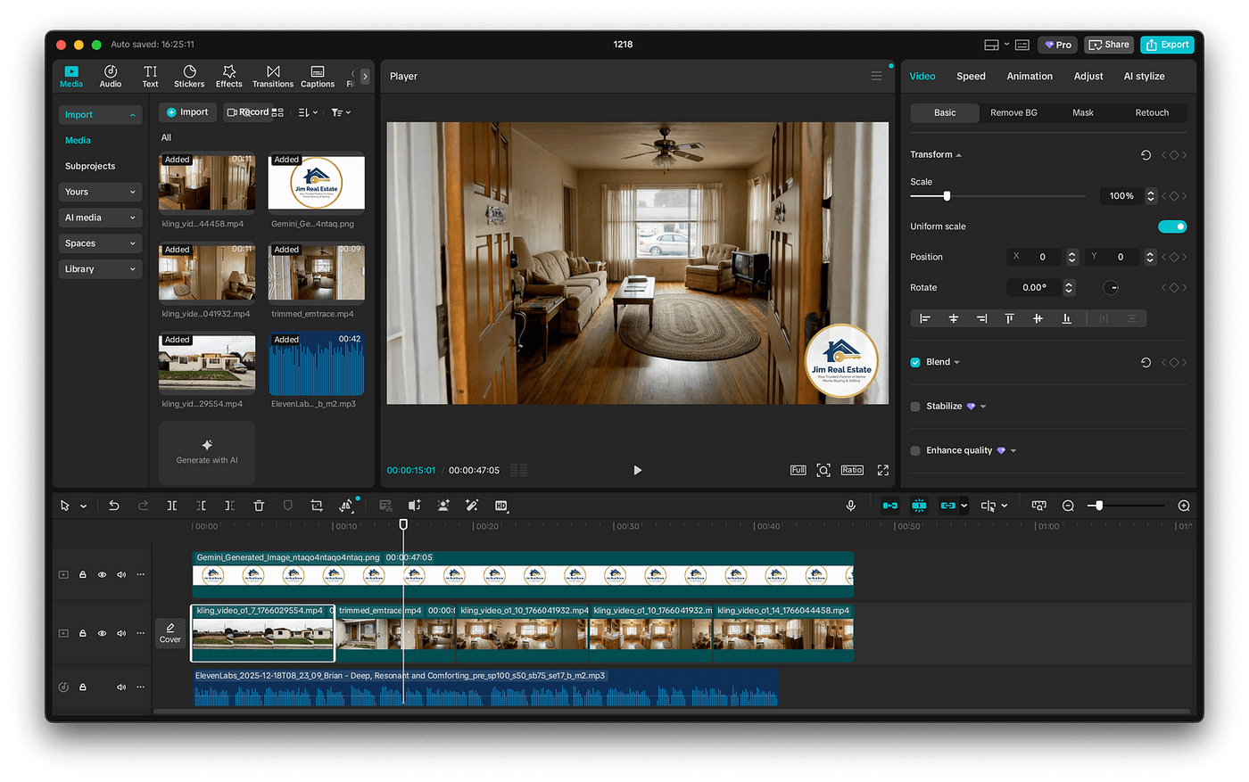 Import all your AI-generated clips and your voiceover into your video editor of choice. In the screenshot below, I used CapCut because it’s fast and free, but you can use Premiere or DaVinci if you prefer. This is also the right time to slap your agency logo or contact info on the footage.