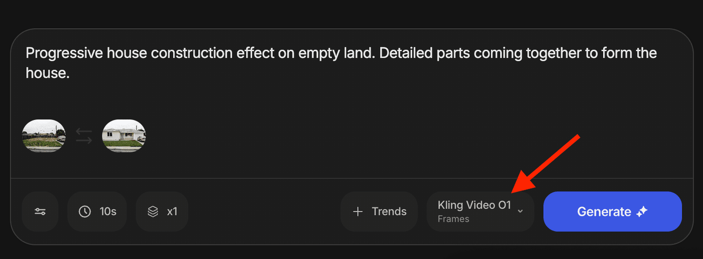 For this guide, upload your empty lot as the start frame and the original house photo as the end frame. Set the video length to 10 seconds to give it enough time to breathe, and use the prompt below.