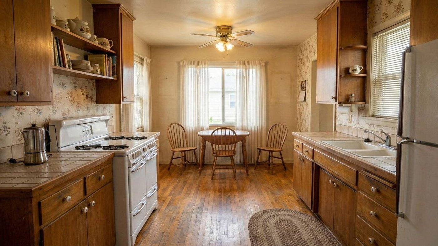 Prompt: A camera showing the living room, and it pans to the kitchen area. There should be no cut in the video, and the camera acts as if held by a cameraman.