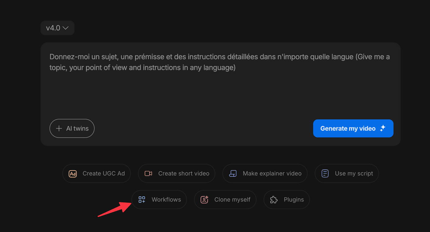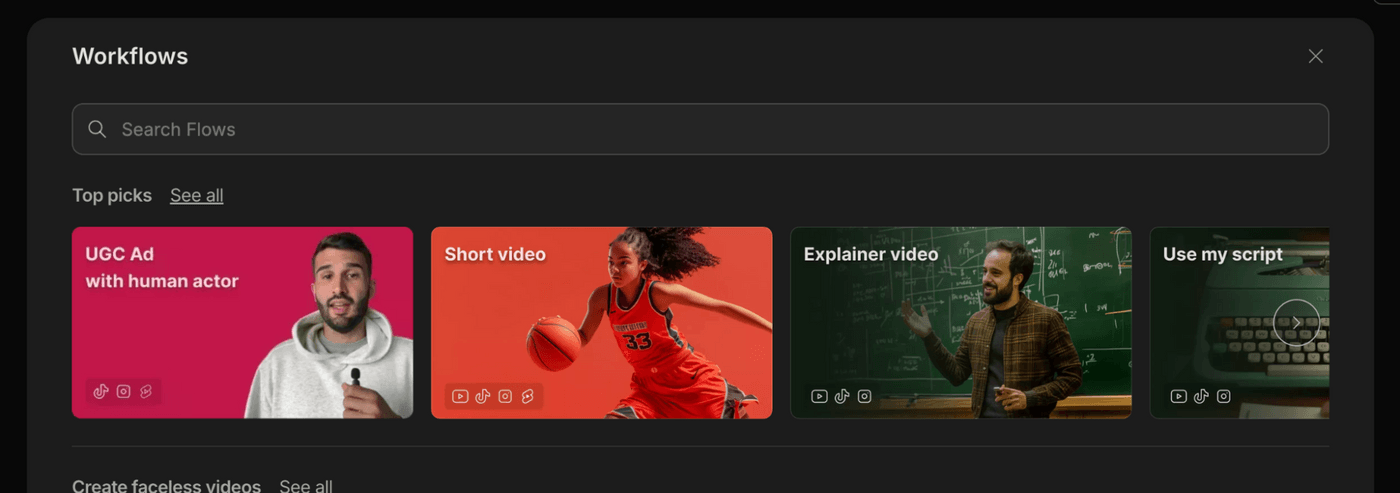 There are workflows for brand story, Shopify link to video, Script to ad, and TiktTok shop video. Browse through them and pick one depending on the video type you want to make.