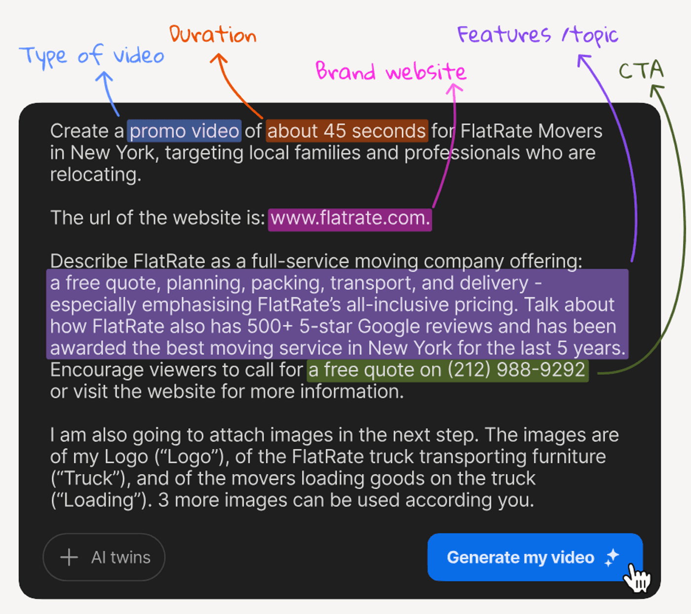 Video Type: "Create a promo video for..." Be as granular as possible on the type of promo video and what you are using it for.