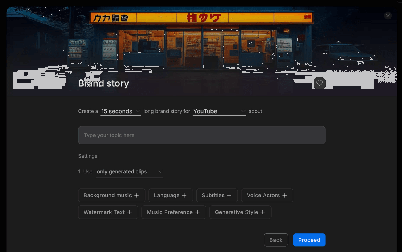Then add your watermark text, music preferences, and generative style and click Proceed.