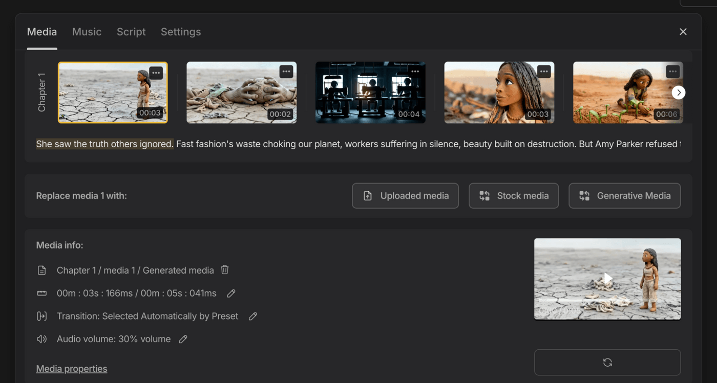 You can swap any clip with generative media, stock footage from the library, or upload your own B-roll. You can also generate new music, browse stock tracks, or upload your own audio file.