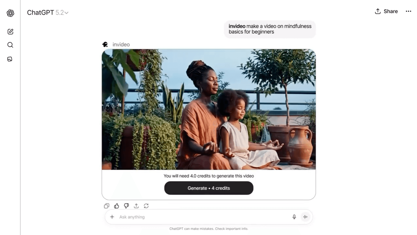 Inside ChatGPT, the invideo app behaves like an AI production team: it turns your prompt into a script, breaks it into scenes, chooses or generates visuals, adds AI voiceover and music, and returns a complete draft video.