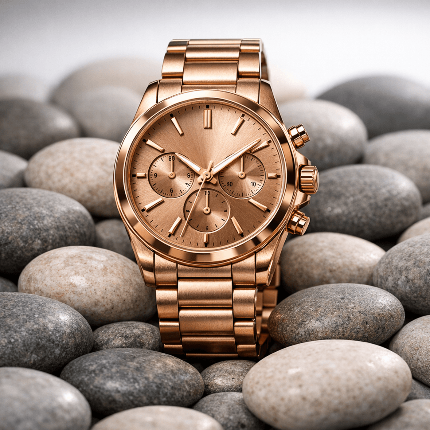 Prompt: Goal: Photorealistic product photo for ecommerce and ads. Subject: Luxury watch on a bed of pebble shaped rocks. Material/finish: Rose Gold, with realistic texture and subtle imperfections. Lighting: soft studio lighting with a gentle rim light, realistic shadows and reflections, clean background. Composition: centered subject, shallow depth of field, minimal props, premium look. Constraints: no text, no watermark, no logos, no extra objects.