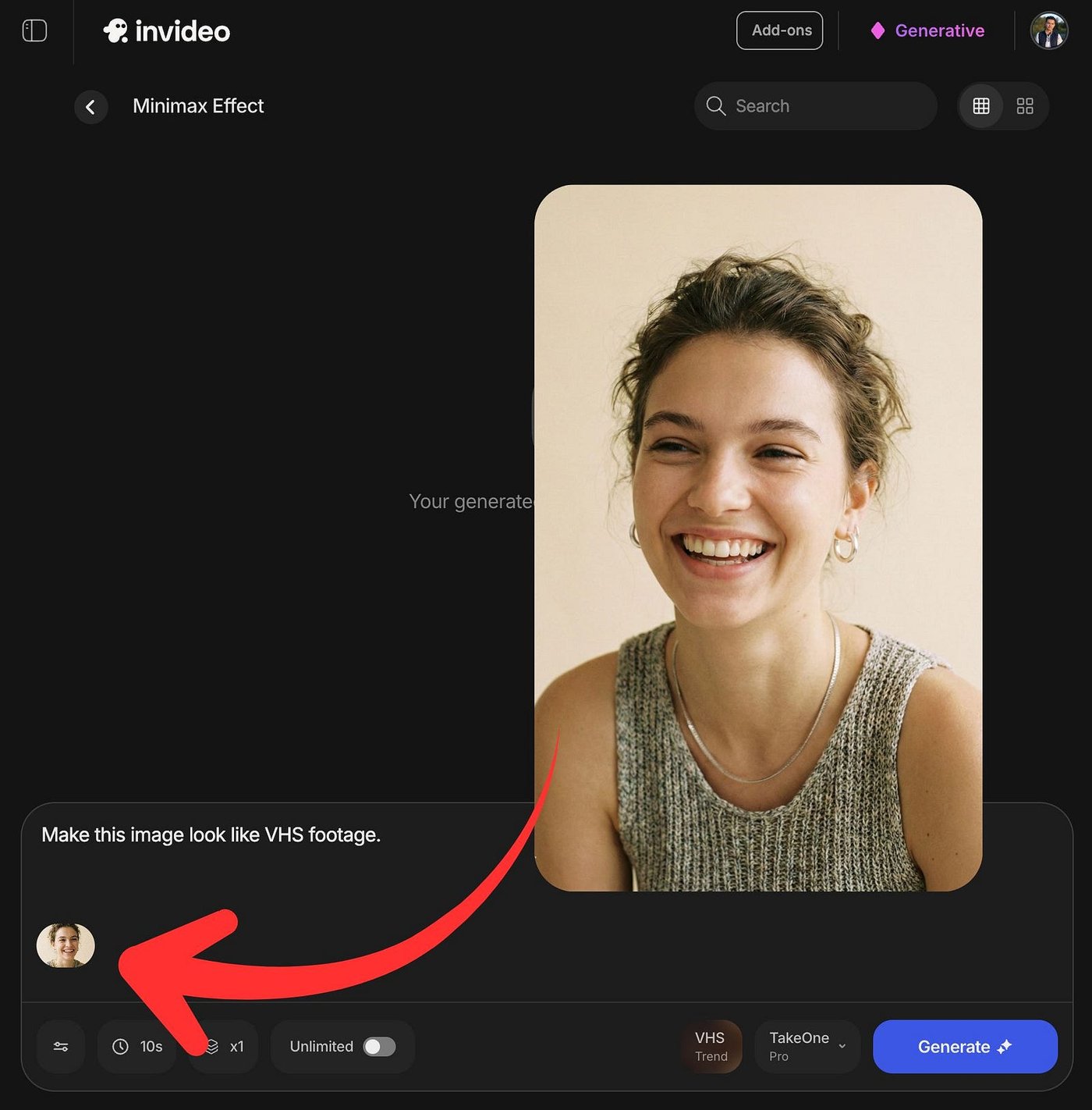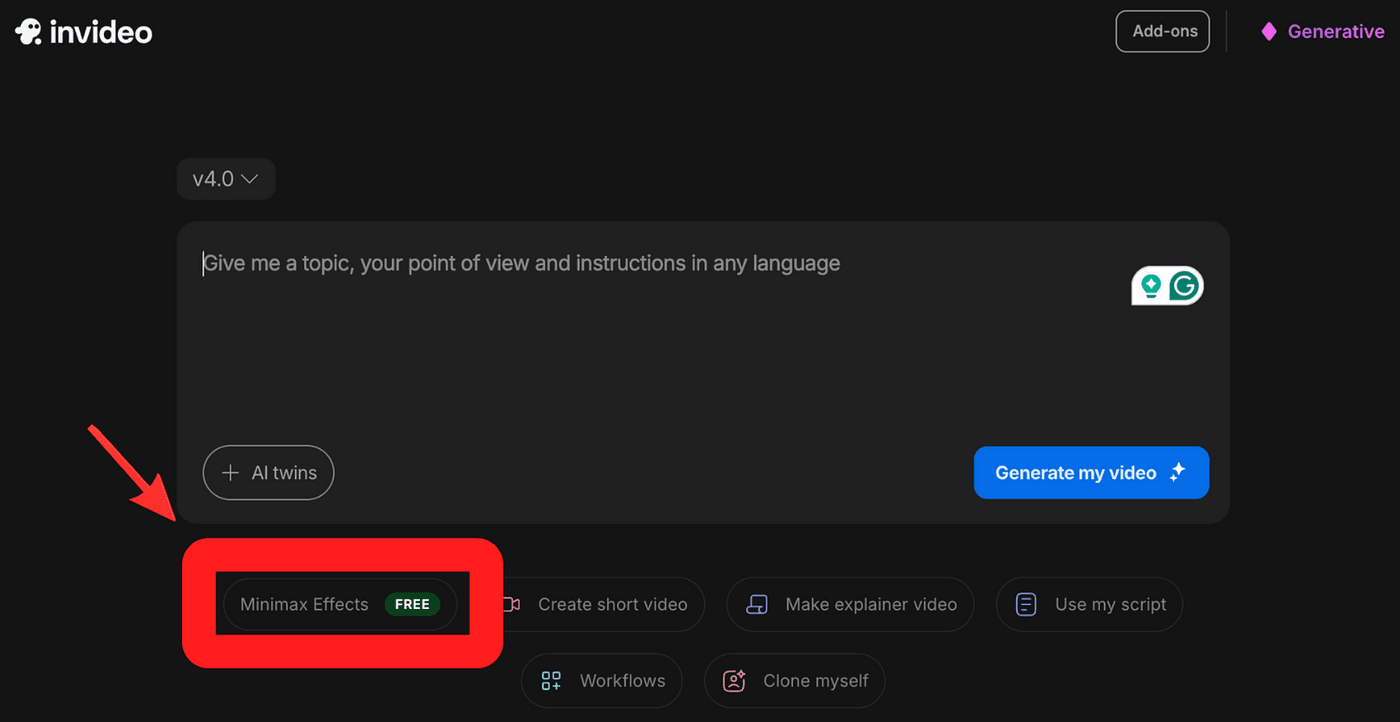 To get started, head over to invideo and create an AI video. Under the prompt field, click the “Minimax Effects” tag.