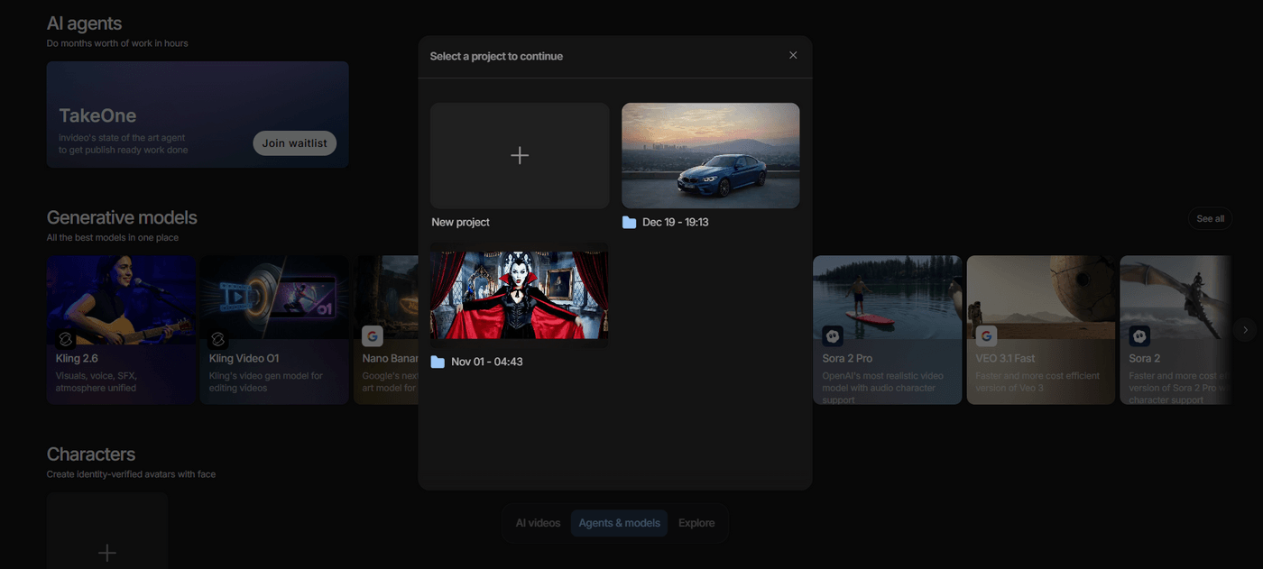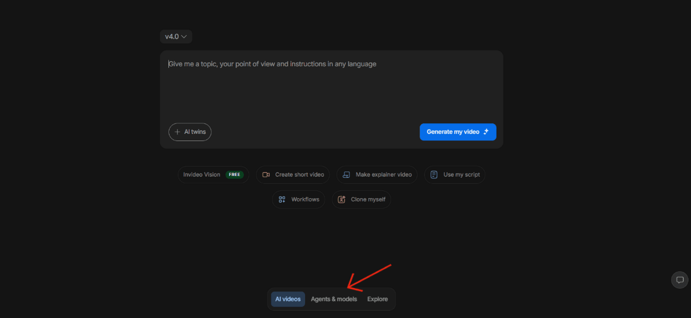 1. Once you sign into your invideo account, scroll down and click on “Agents and Models” to browse different trends available on the dashboard.