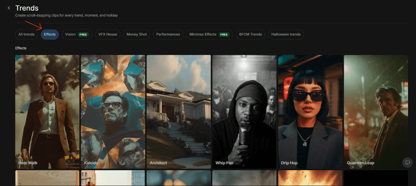 2. From the “Trends” section, choose any category that fits your requirements. For this example, let’s go with “Effects.”