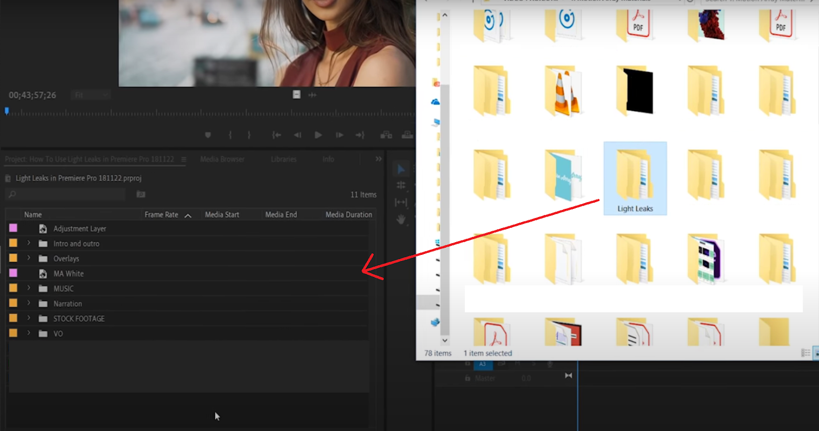 Step 2: Now double click on the “Light Leaks” folder in your project manager and select the overlay you want to use. Drag and drop the selected overlay on the layer on top of your video in the Timeline.