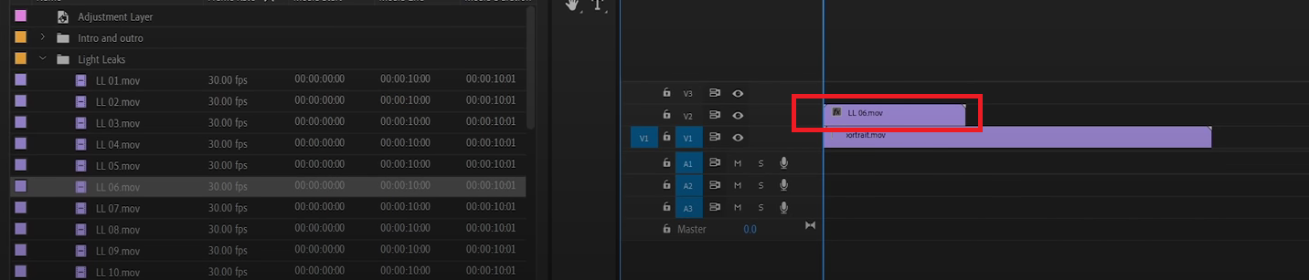 Step 3: You’ll notice that your video will now be hidden behind the light leak overlay. But that’s okay. To bring your video forward, you need to select and highlight your light leak footage first.