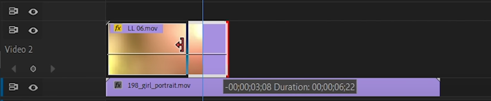 Step 8: You can also shorten or lengthen your light leak overlay video by selecting it and dragging the red arrow cursor left or right.