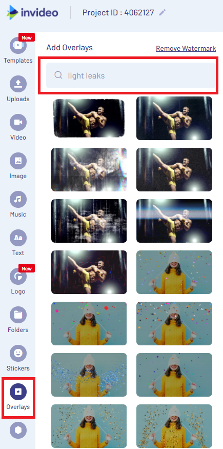 Step 4: Now go to the menu on the left corner of your screen and click on the “Overlays” section. In the search bar, type “light leaks.”