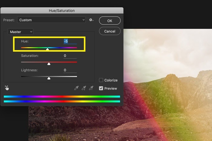 Step 5: Now drag the “Hue” slider left or right to change the color of the light leak.