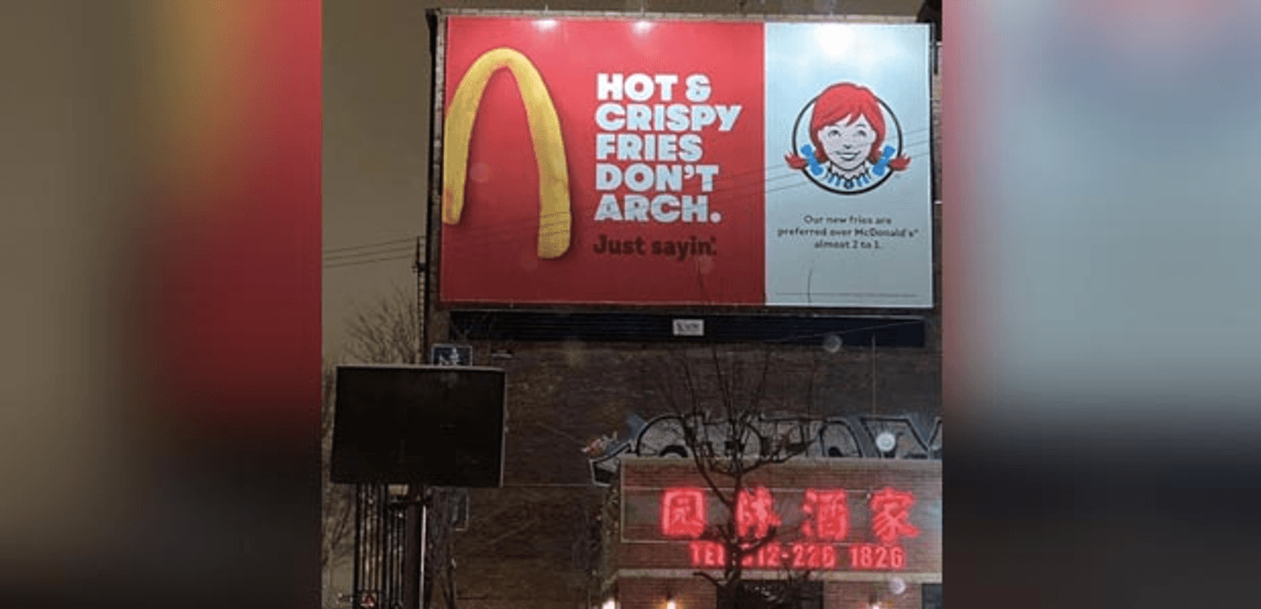 An interesting example of comparative advertising is Wendy’s 2022 campaign that showed a bent fry shaped like McDonald’s famous golden arches and added the line, “Hot & Crispy Fries Don’t Arch. Just Sayin’.” They didn’t mention McDonald’s directly, but the curved fries and the arches made it obvious who they were talking about.
