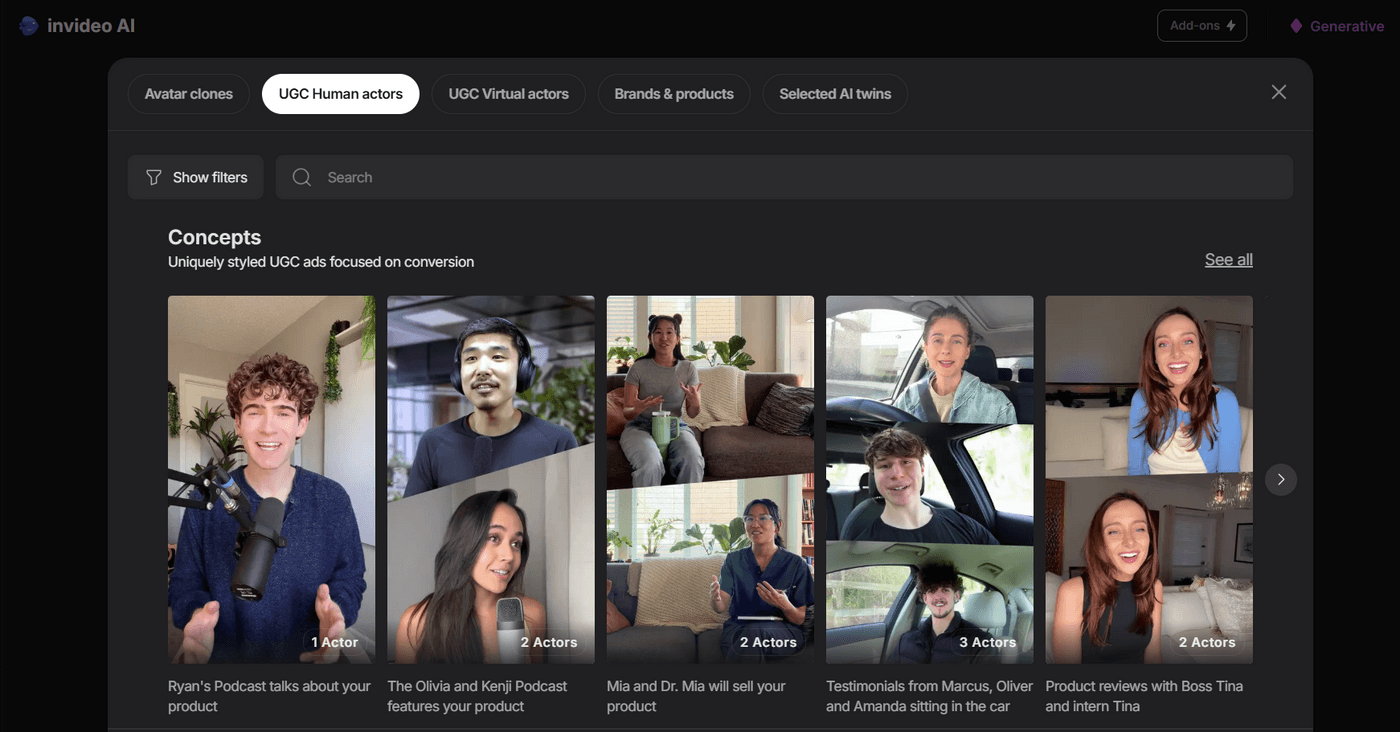 Create authentic creator-style product videos with invideo AI with no camera or real actors needed.
