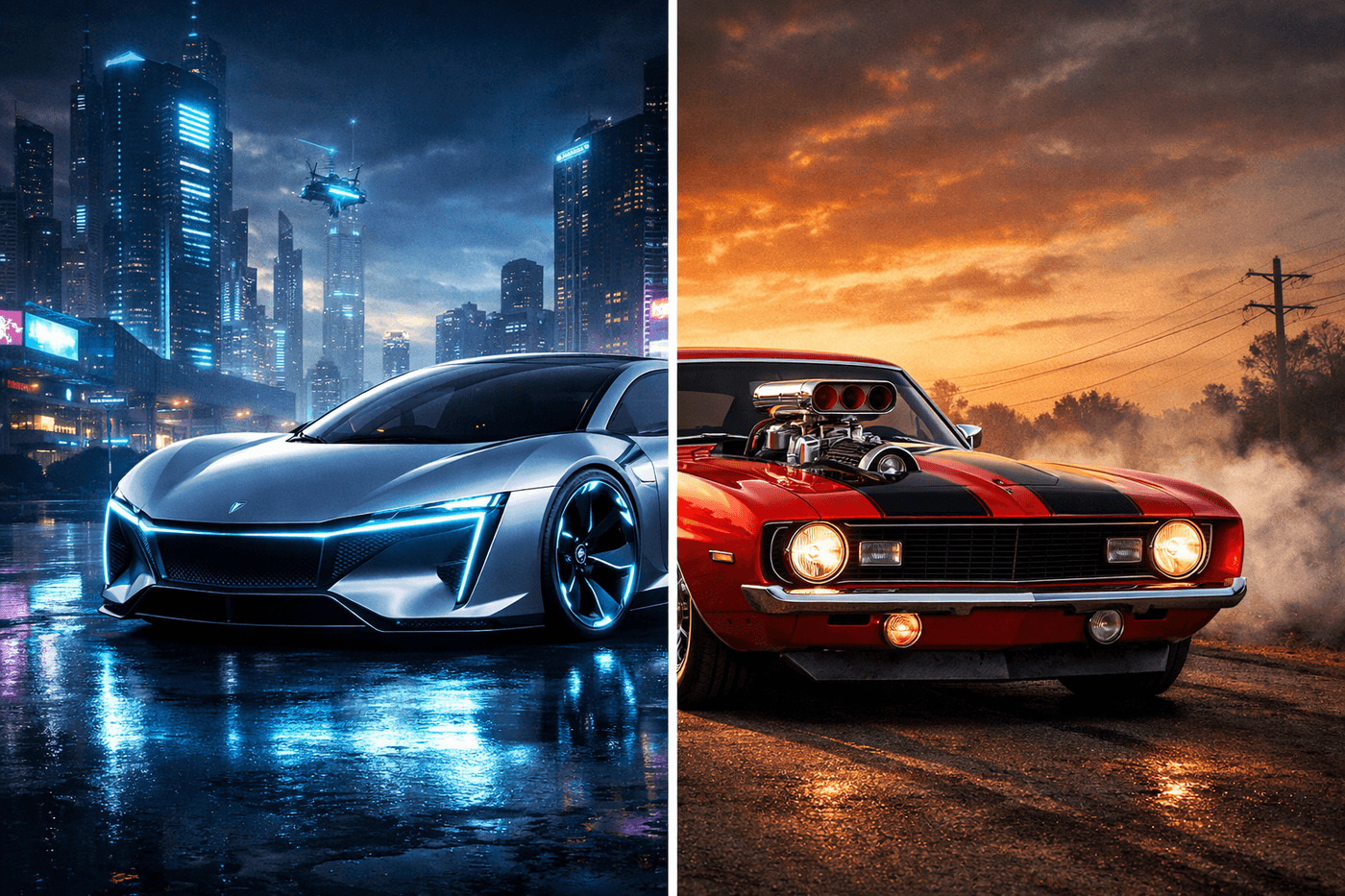 Futuristic electric car vs classic muscle car, split-screen composition