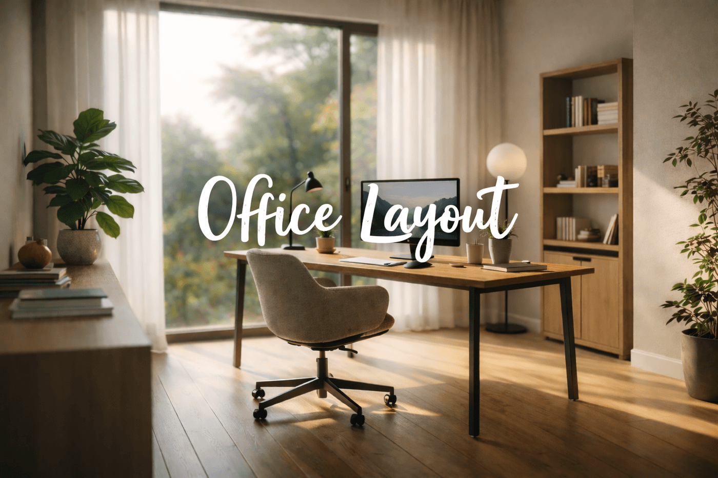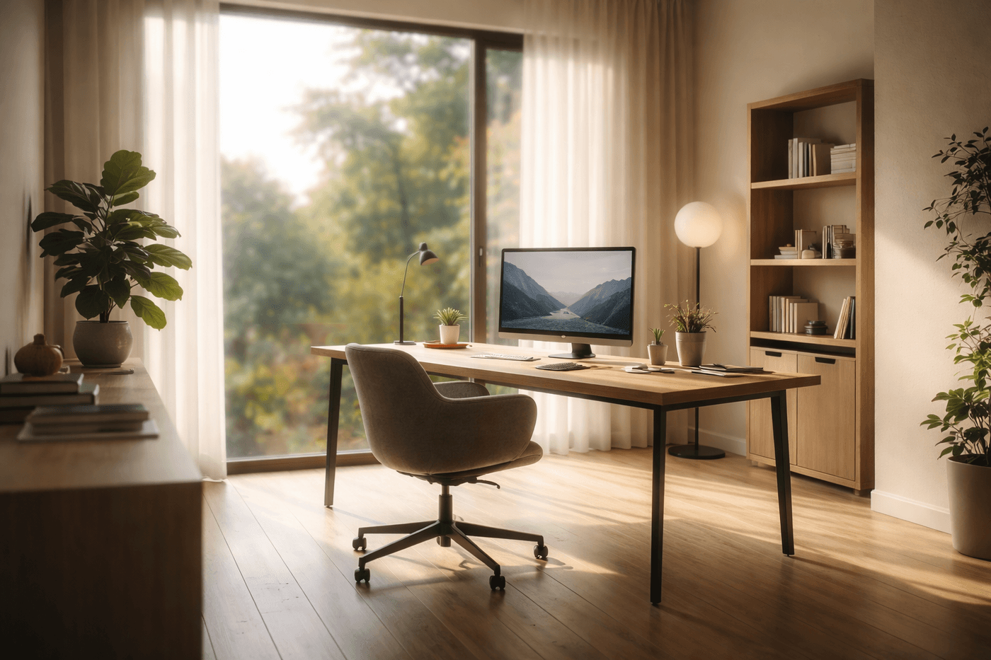 Modern minimalist home office, large window with city skyline, morning sunlight, cinematic blur, 8k resolution
