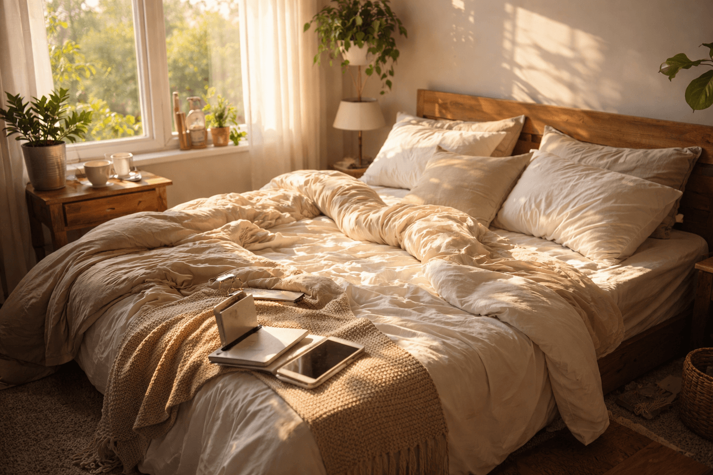 Morning routine scene with messy bed and sunlight streaming in