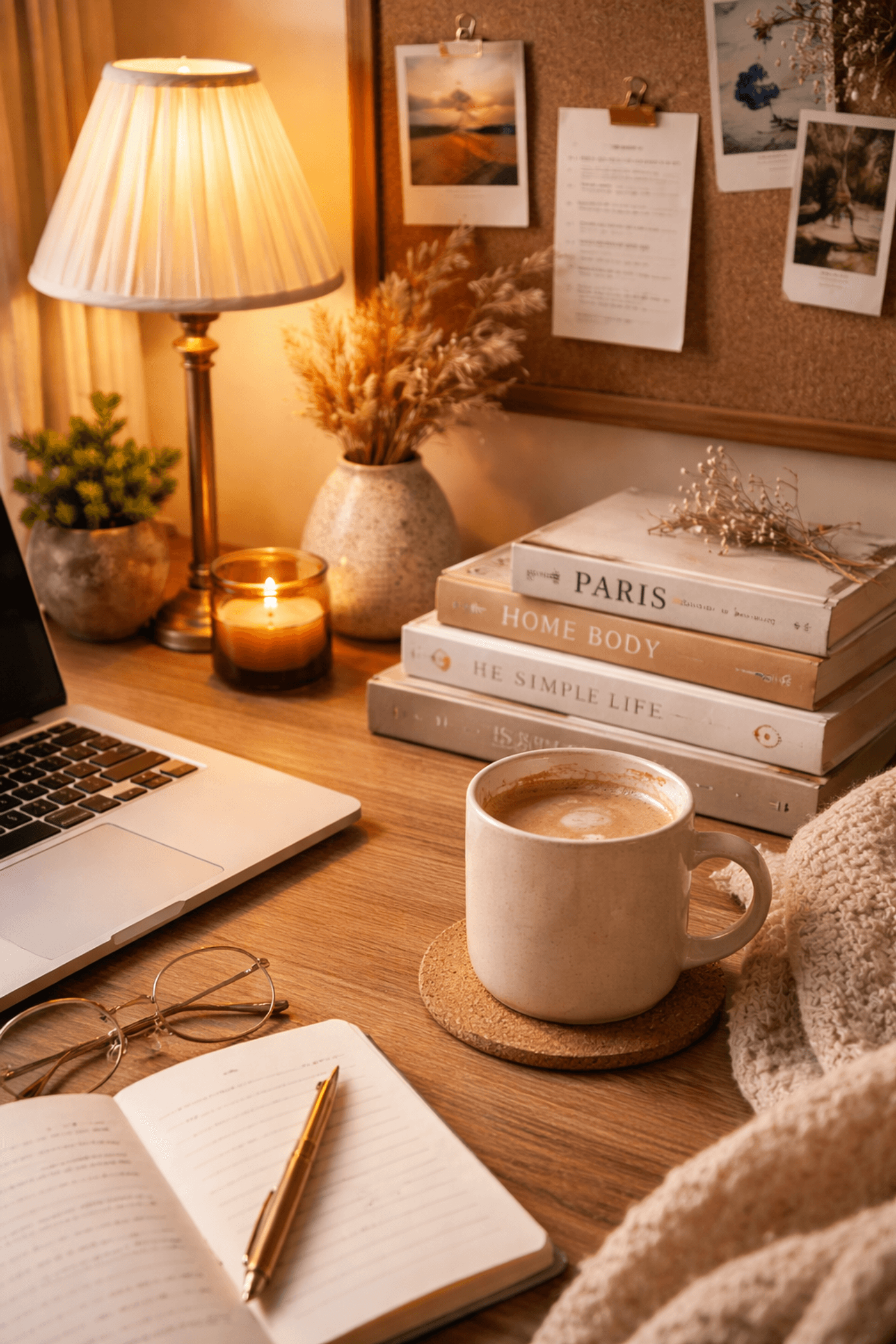 Cozy desk setup with warm lamp lighting, books and coffee, soft shadows, Instagram aesthetic