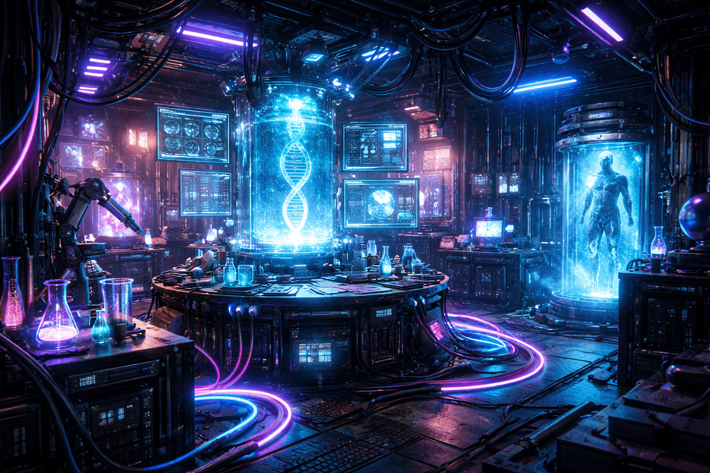 Cyberpunk laboratory, glowing neon wires, holographic screens, ultra-detailed, 3D render