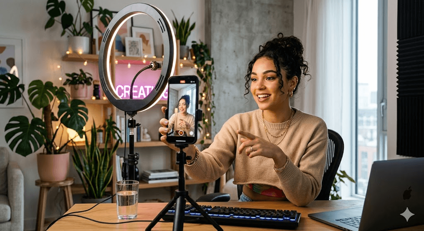 Influencer recording a reel with a ring light reflection and a modern setup