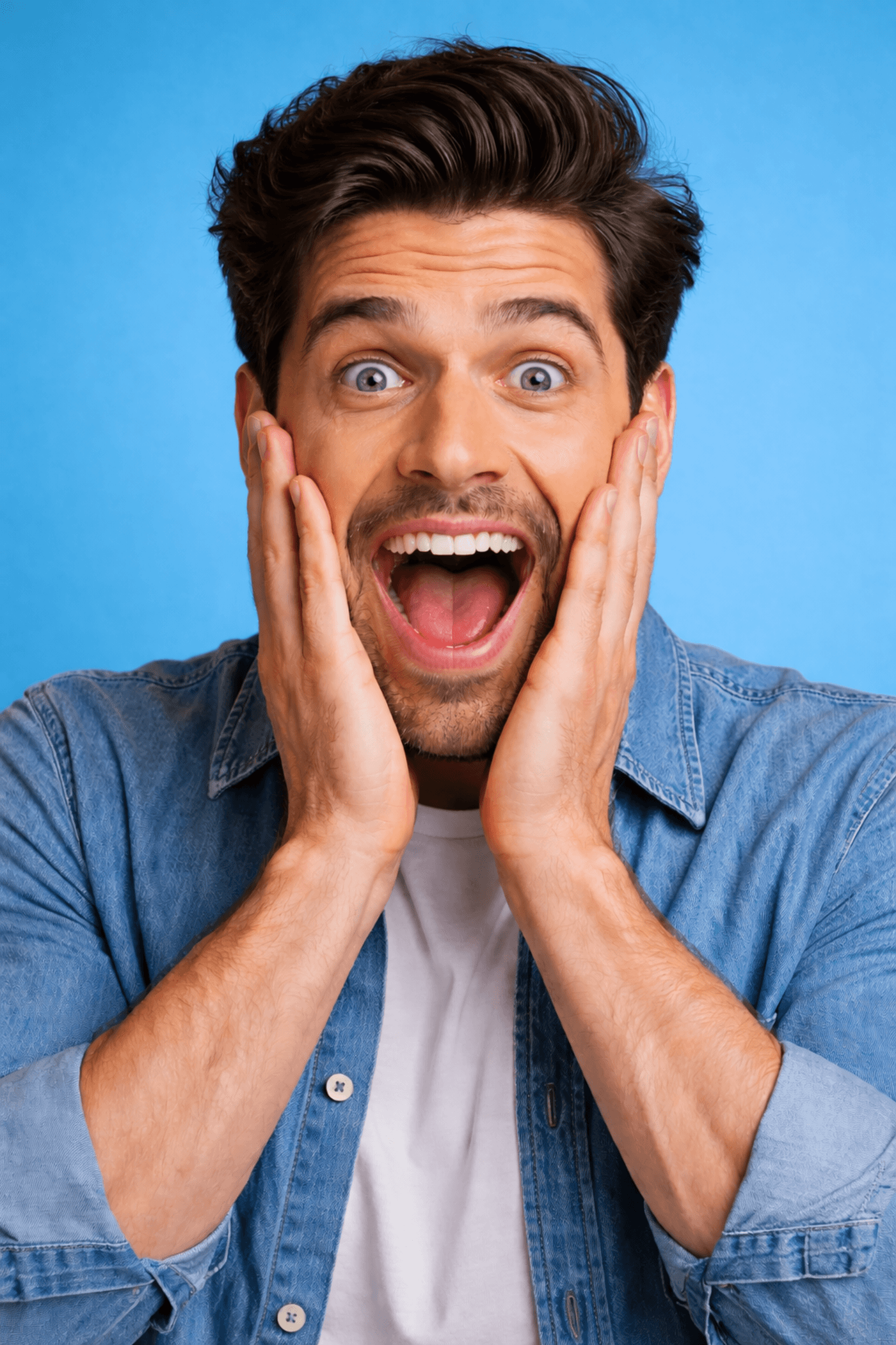 Close-up of a surprised man, expressive eyes, vibrant orange background, studio lighting