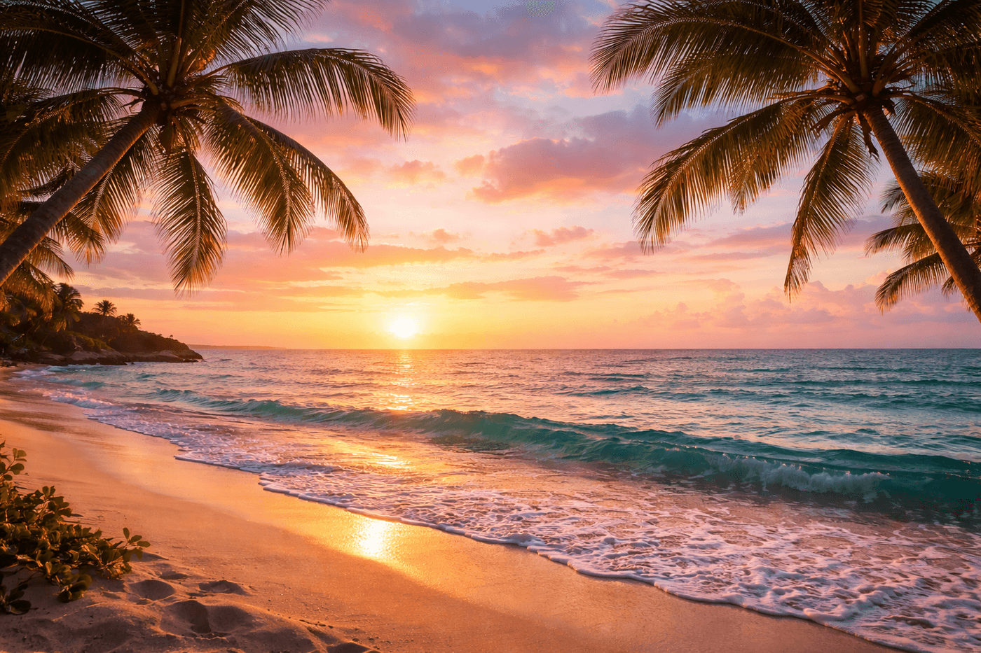 Tropical beach sunset, pastel sky, soft waves