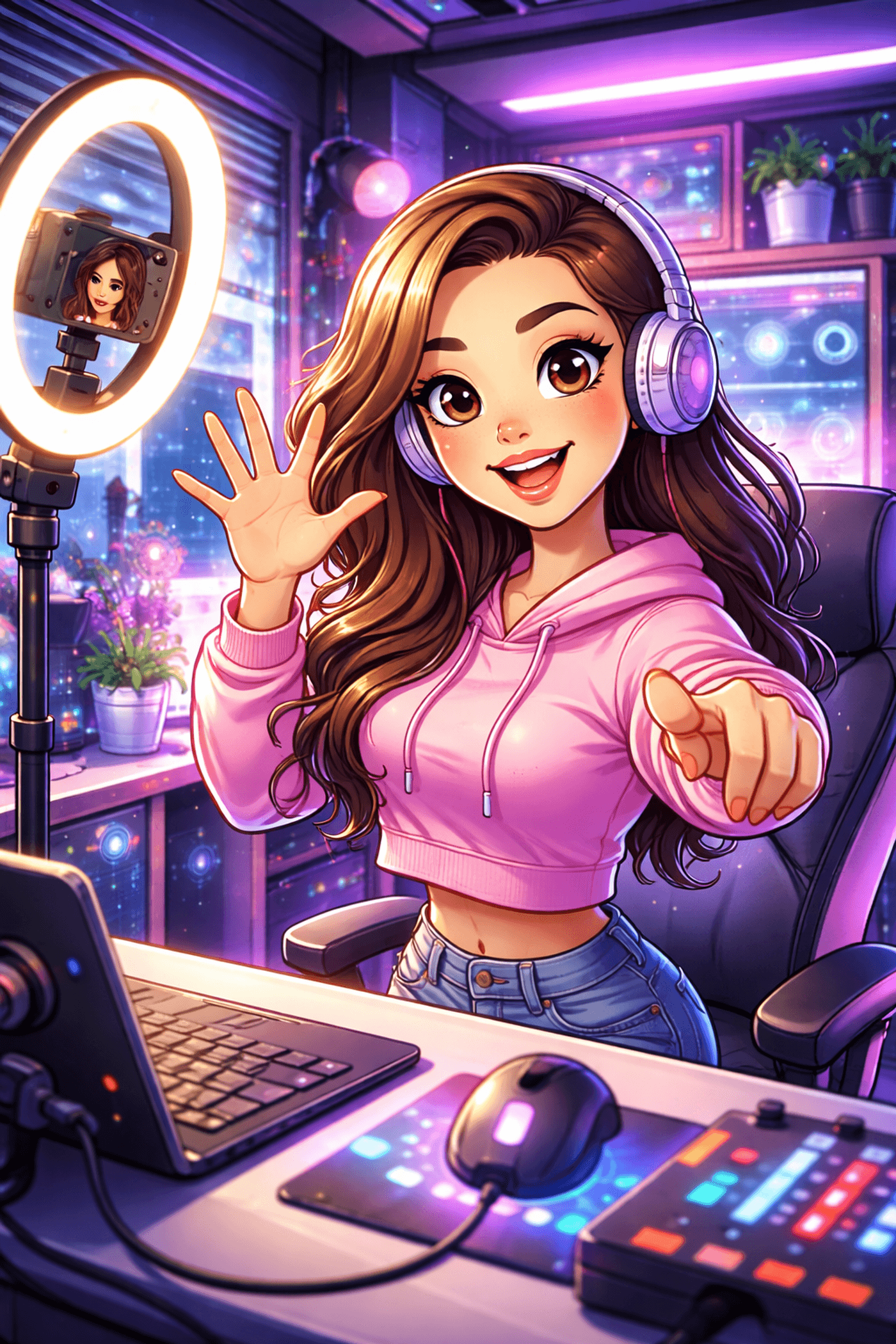 3D chibi female gamer with glowing keyboard, Pixar-style animation