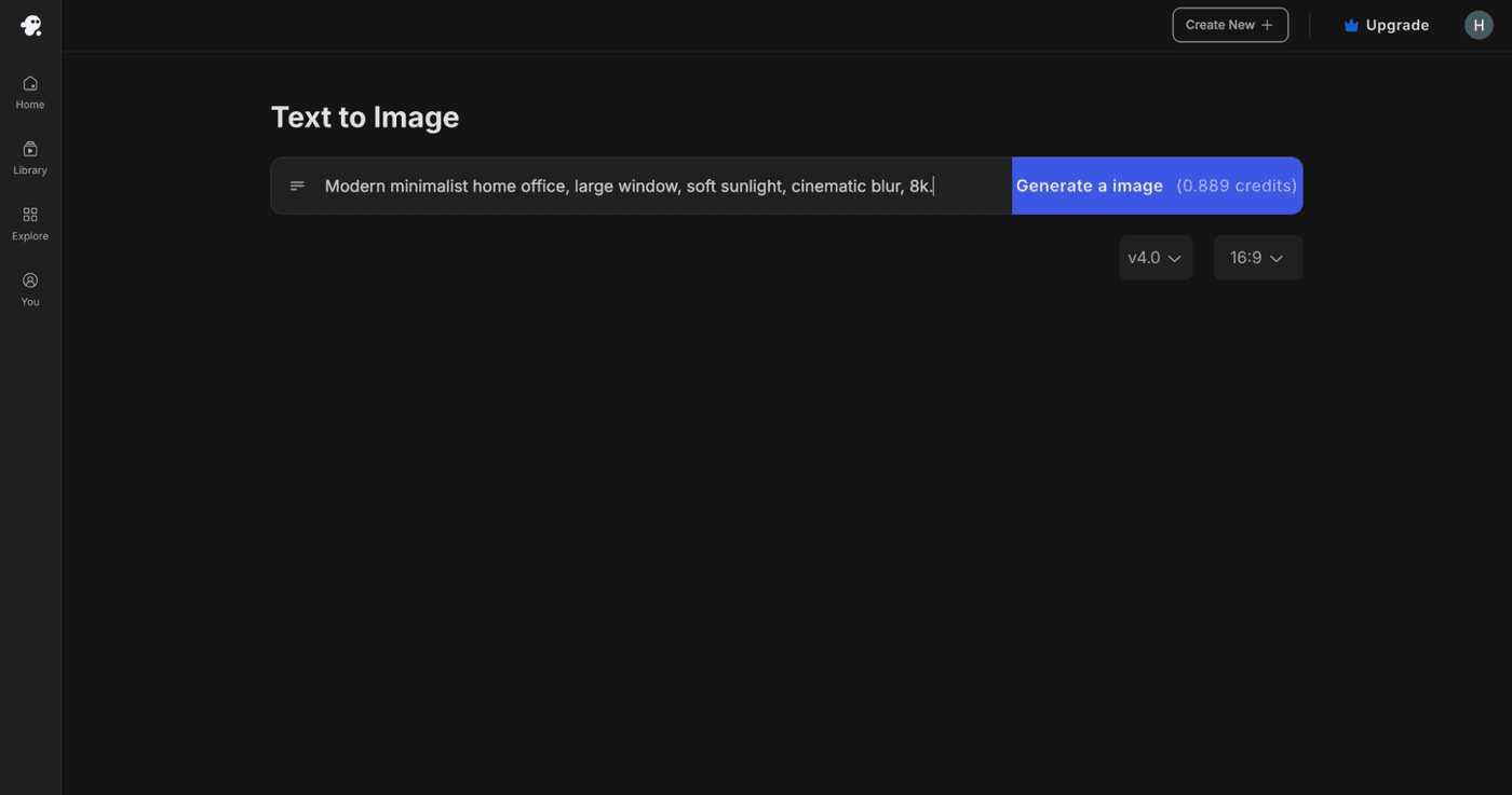 Copy one of your prepared prompts and paste it into the input box. For example: “Modern minimalist home office, large window, soft sunlight, cinematic blur, 8k.”