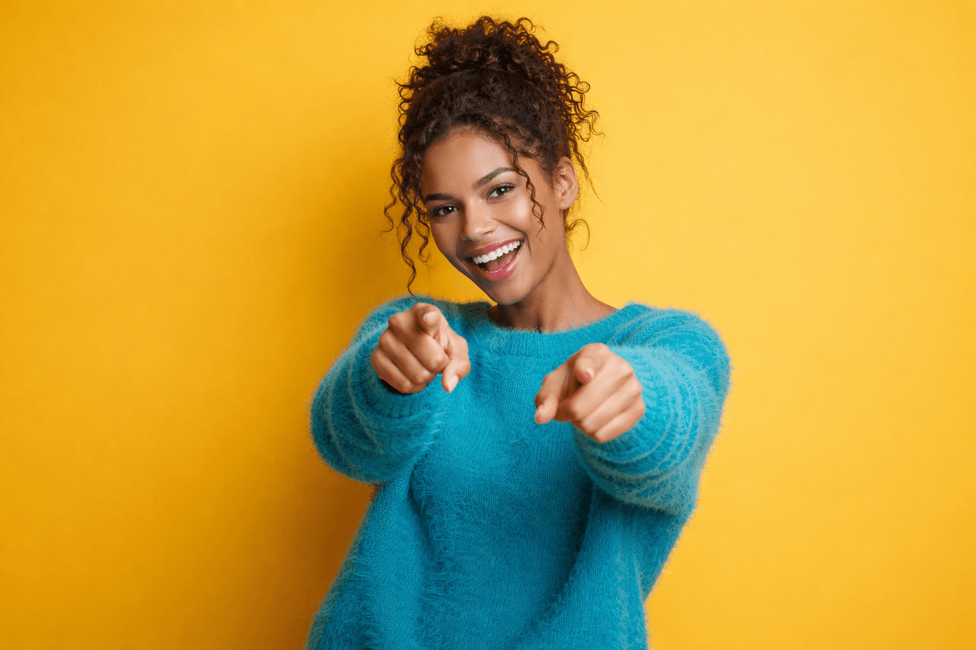 Creator pointing at something off-screen with an excited expression
