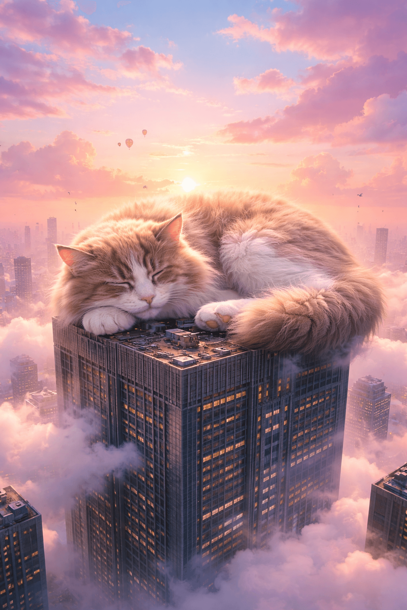 Giant fluffy cat sleeping on a skyscraper, surreal, pastel sky