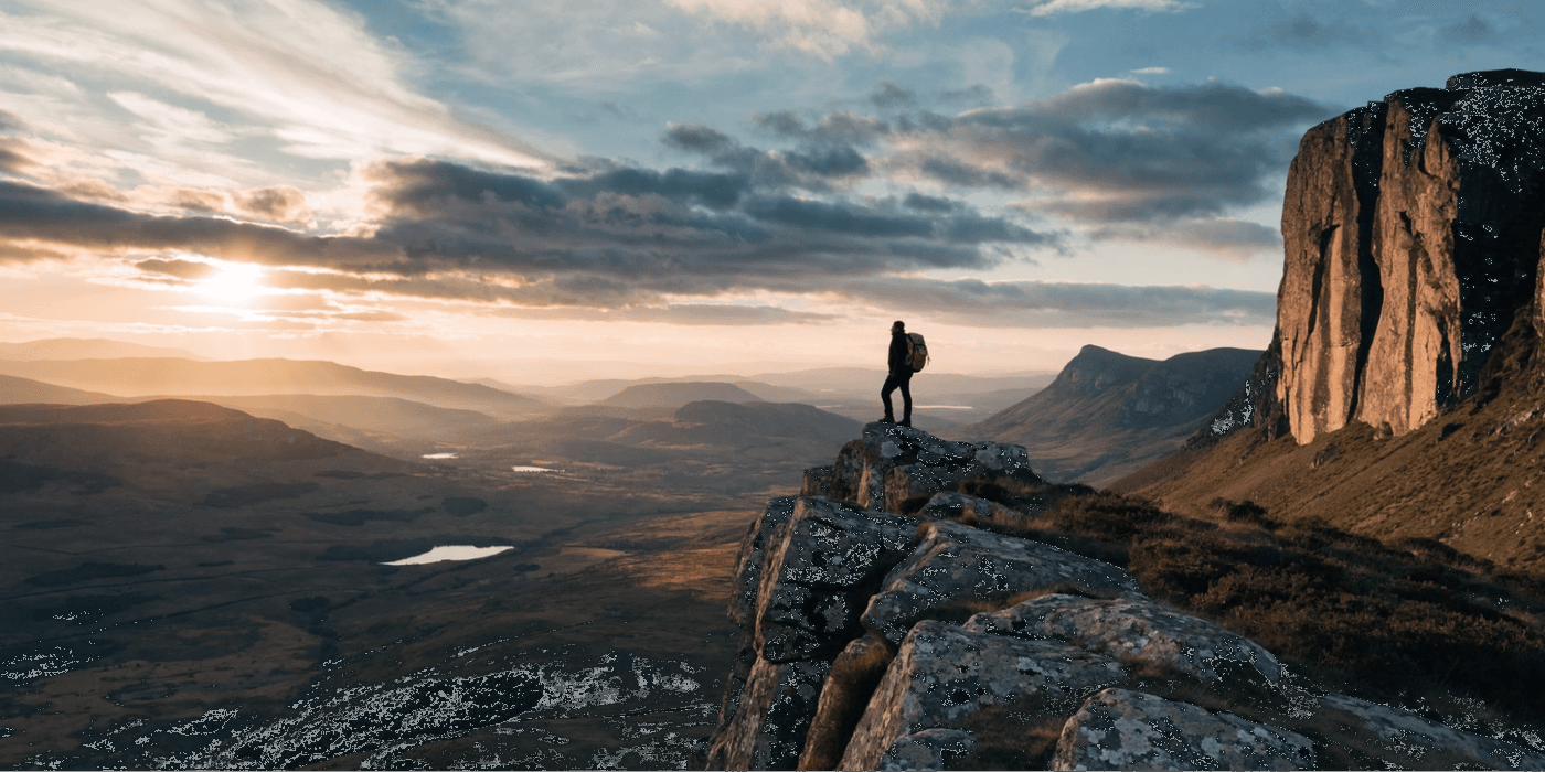 Prompt: Wide shot of a lone hiker on a ridge at sunset, warm backlight, soft haze in the distance.